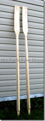 изготовление веселвеслаСами весла делал из горбыля. Вначале нарисовал контуры и бензопилой выпилил заготовки, а потом рубанком и стамеской выстрогал весла, сделал отверстия под уключины. Весла покрасил, оставив некрашенными только рукоятки. Их просто покрыл водной морилкой под цвет дуба. Рукоятки со временем сами отполируются ладонями. А держаться руками за некрашенное дерево гораздо приятнее.