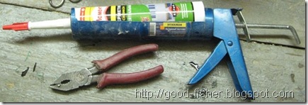 Вначале обшили борта. Каждый борт собран из 3 заготовок. С двумя задними листами никаких проблем не возникло, так как они  прямоугольной формы.  Пробойником делали герметикотвестия и,  смазав деревянные части каркаса силиконовым нейтральным герметиком  "Момент", приколачивали железо к ним  гвоздями.  В инструкции к герметику  написано, что он используется и в кораблестроении. Причем, выбрали именно нейтральный, так как  кислотный герметик может разъедать железо. Наносили его, выдавливая из тубы  с помощью специального пистолета. Застывает герметик довольно быстро и отлично склеивает металл с  деревом. Для пробы я скрепил деревянный брусок с листом металла и через сутки уже не смог оторвать их друг от друга двумя руками. Передние листы железа выгибали по форме форштевня.